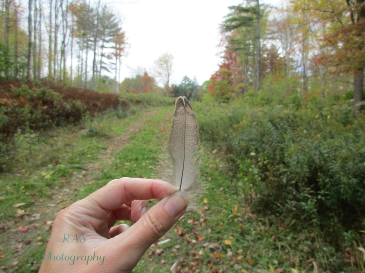 My mom and I went for a walk up in a nearby field, as we’re want to do, and I discovered this little feather! It looks like it may be a small feather from a turkey, or some similar wild bird: