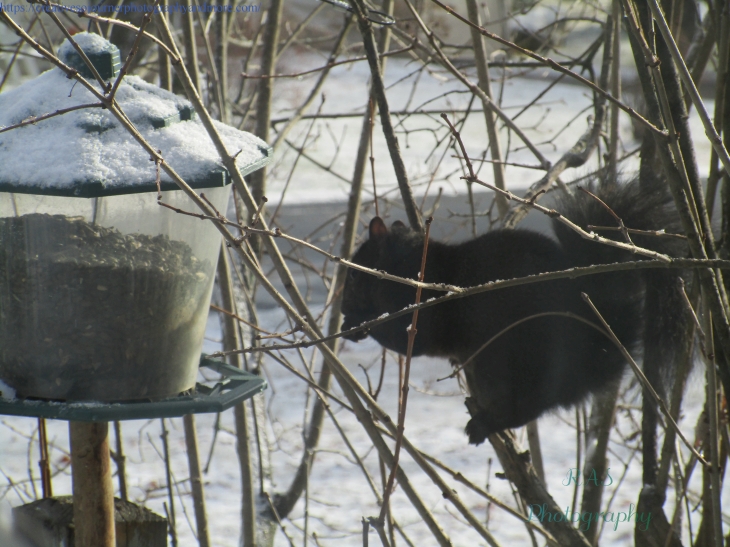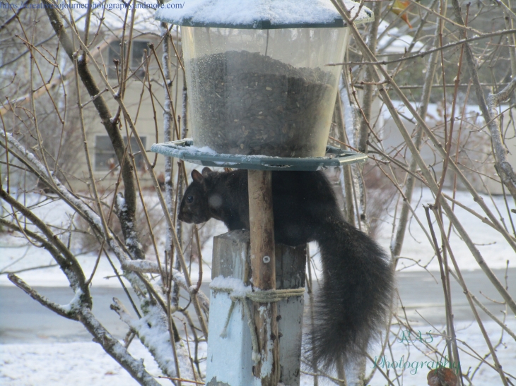 Here’s our friendly black squirrel again trying to get some food from one of our feeders: