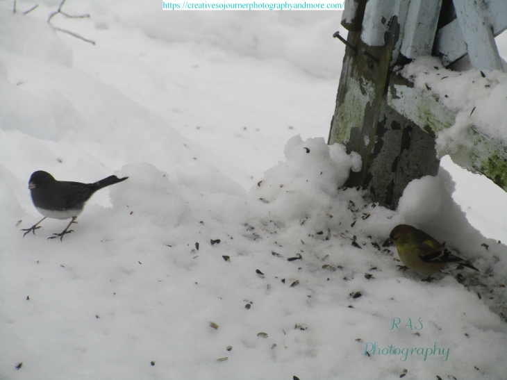 There are many kinds of birds that stop at our feeders to eat, including this little junco and finch: