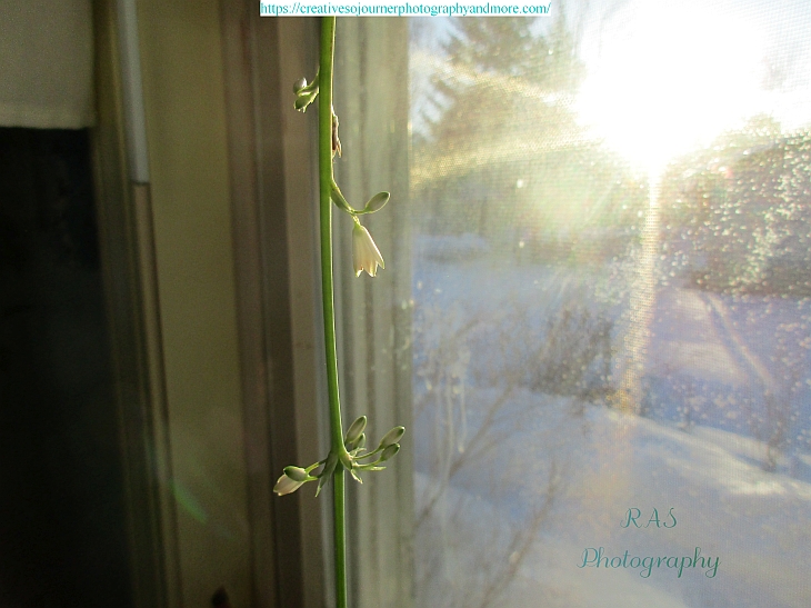 One of our spider plants is producing flowers now, which look pretty shining in the early morning sun: