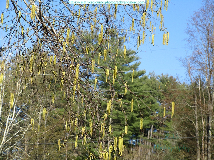 The birch trees have their buds out, unfurled like earrings hanging from the branches: