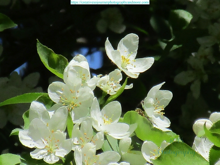 All of the apple and crab apple trees are blooming now, giving off a sweet scent…both white and different shades of pink: