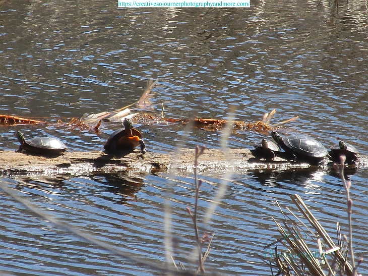 Earlier this summer I went birding with my oldest niece. Not only did we see many types of birds, but also these cute turtles sunning themselves on this log: