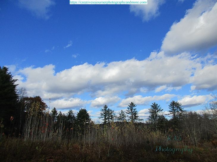 Many small trees are growing up in a nearby field, most of which have lost many of their leaves: