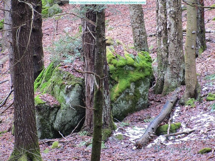 There are several rocks covered in moss in the nearby woods, adding some color to the otherwise brown landscape: