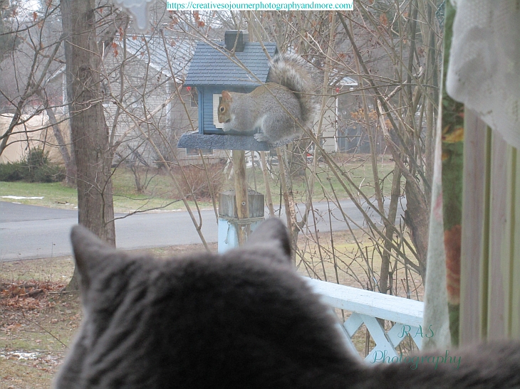 Squirrels and chipmunks also like to come to our bird feeders, and our cat enjoys looking at them out the window: