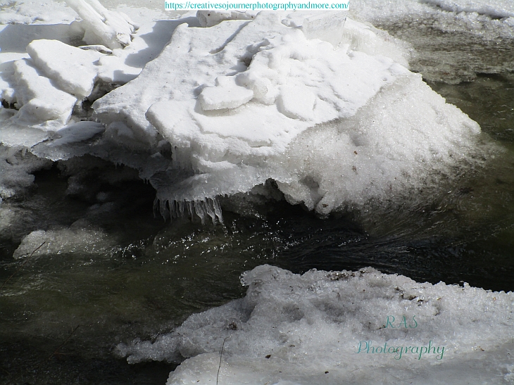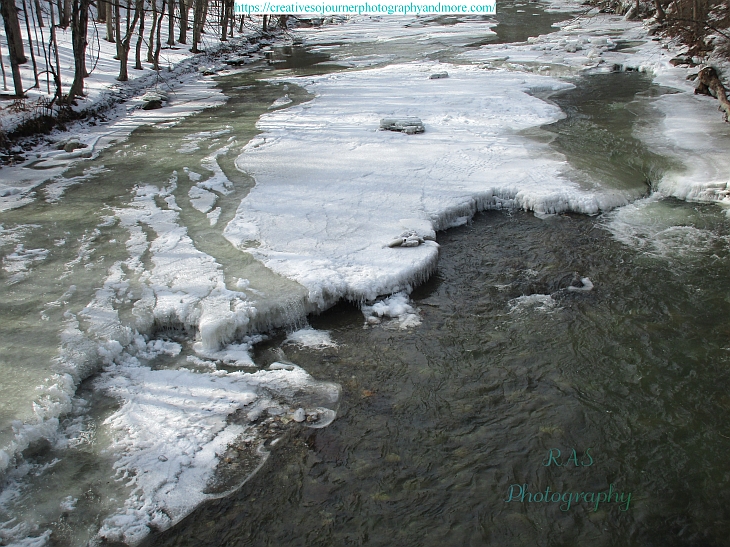The nearby brook looks pretty all covered in ice, with some water going over the top: