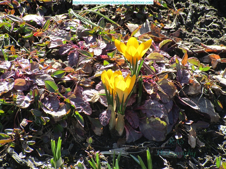 On a recent walk around the block, we happened upon these yellow and purple crocuses, one of the first flowers to bloom in the Spring: