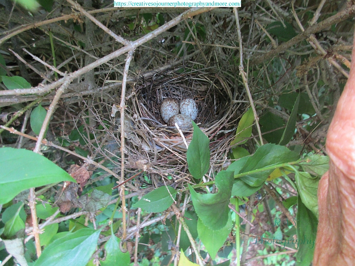 We’ve been seeing cardinals go in and out of our Forsythia bush in our backyard recently, and I just found their nest! It has 3 eggs in it…