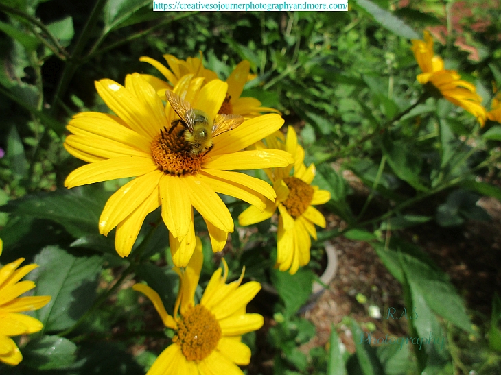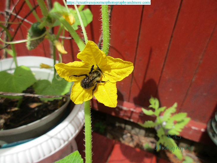 The bees are loving all kinds of flowers in our backyard, like these cucumber flowers, leek flowers, and small sunflowers: