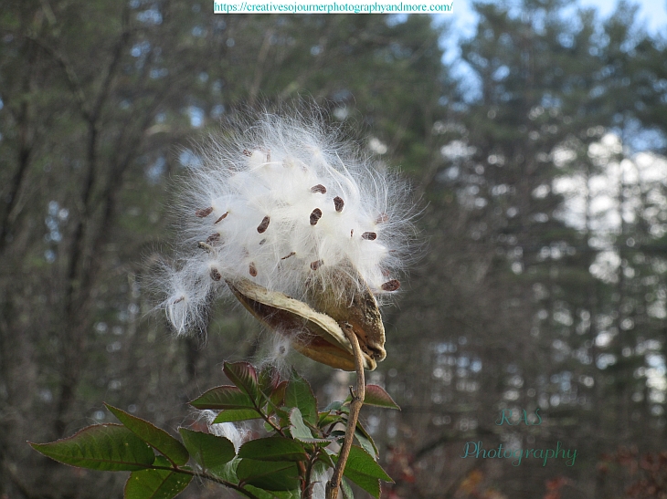 It’s now time when the milkweed seed pods open and spread their fluffy white seeds all around: