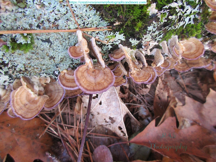 On a recent walk, I came across this log covered in lichen, moss, and this cool fungi called violet-toothed polypore mushrooms: