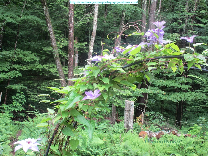 Our pretty purple, and dark pinkish-purple, Clematis are now blooming on our arbor: