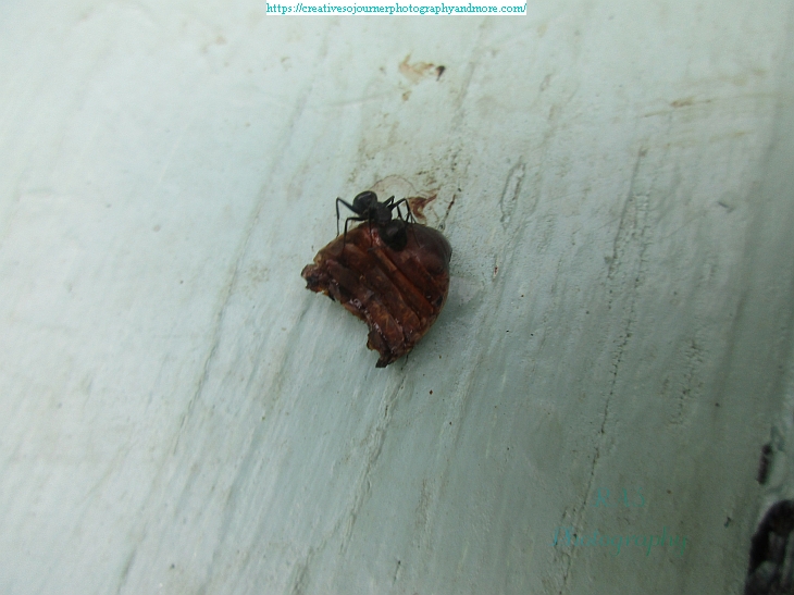 The other day I saw this ant getting ready to eat the remains of a beetle on our back deck: