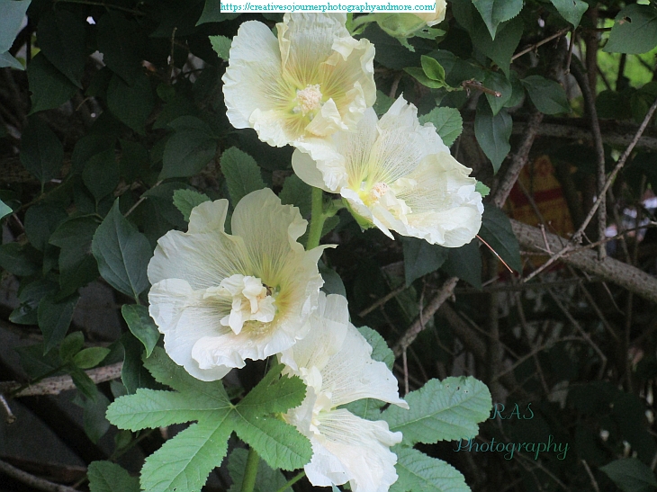 This year we had pale yellow Hollyhocks blooming in our backyard garden: