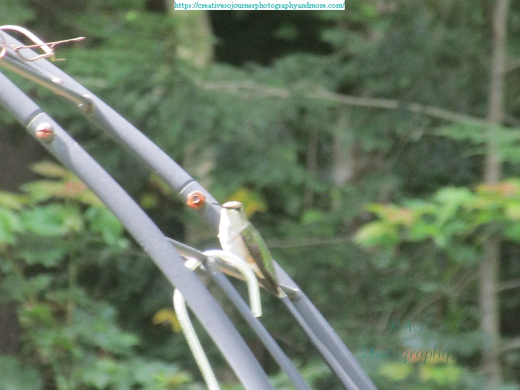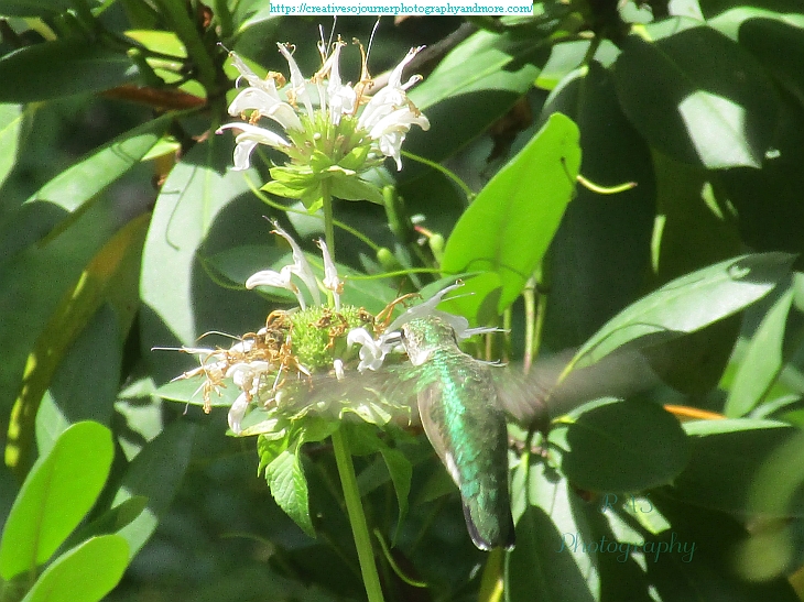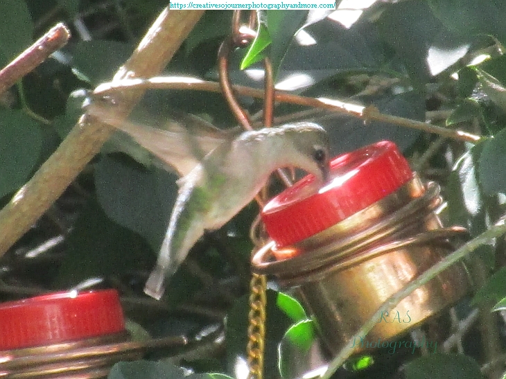 The hummingbirds enjoy visiting our backyard garden, and the hummingbird feeder: