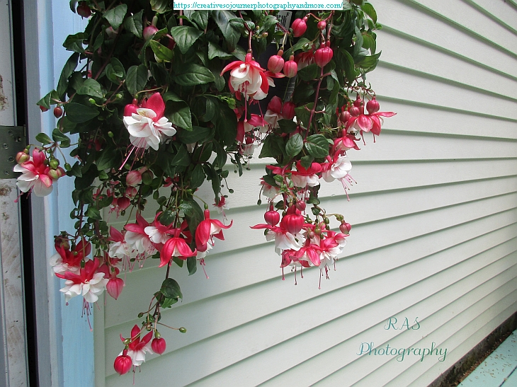 We have a pretty fuchsia blooming on our back deck that the hummingbirds like to visit: