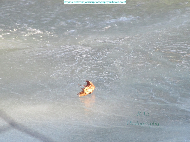A couple of weeks ago, before the latest warm-up, I saw this leaf sitting atop the ice-covered brook: