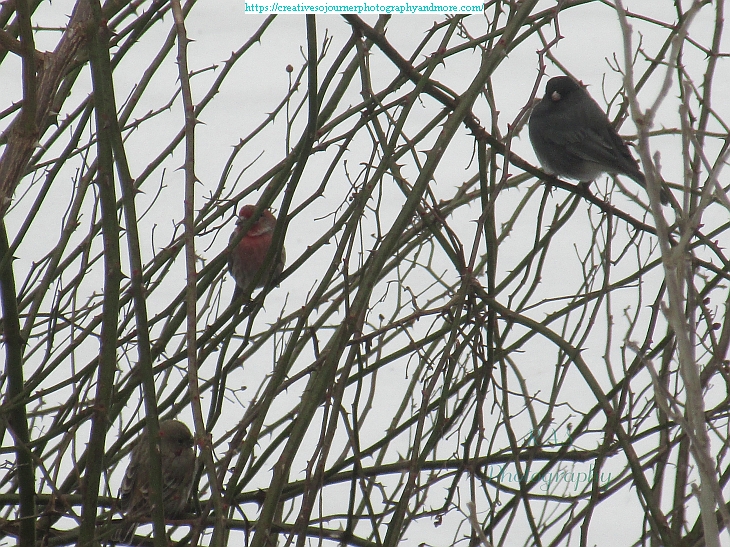 I looked out the window the other day and saw these three birds sitting in a bush. Looks like a junco and two purple finches trying to get out of the cold wind: