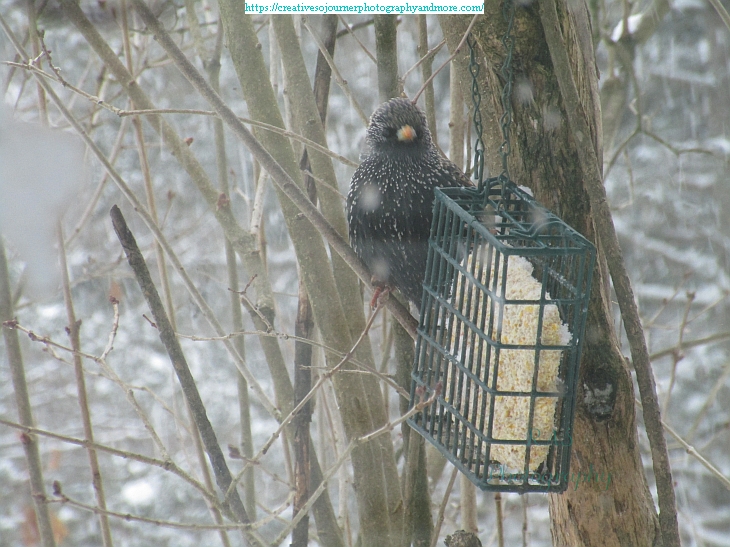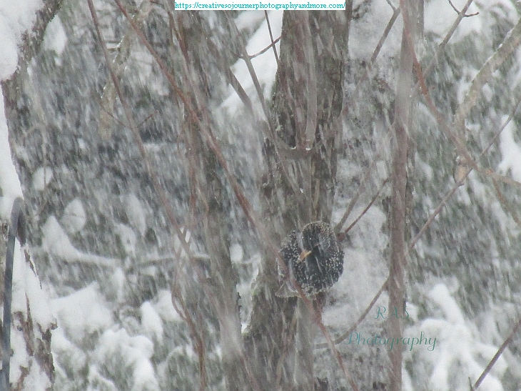 Thank God the snow is now mostly melted! But when we had our last snowstorm, this Starling was hunkered down trying to stay warm: