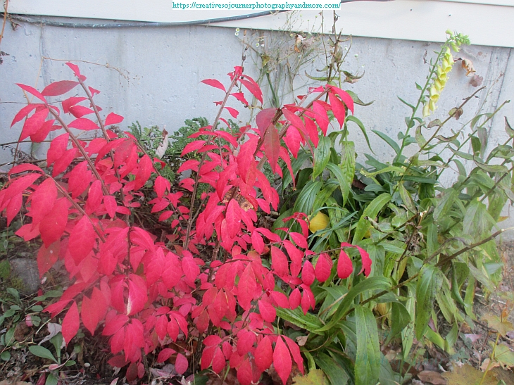Our little side garden still has blooming yellow Foxglove flowers and a pretty red bush: