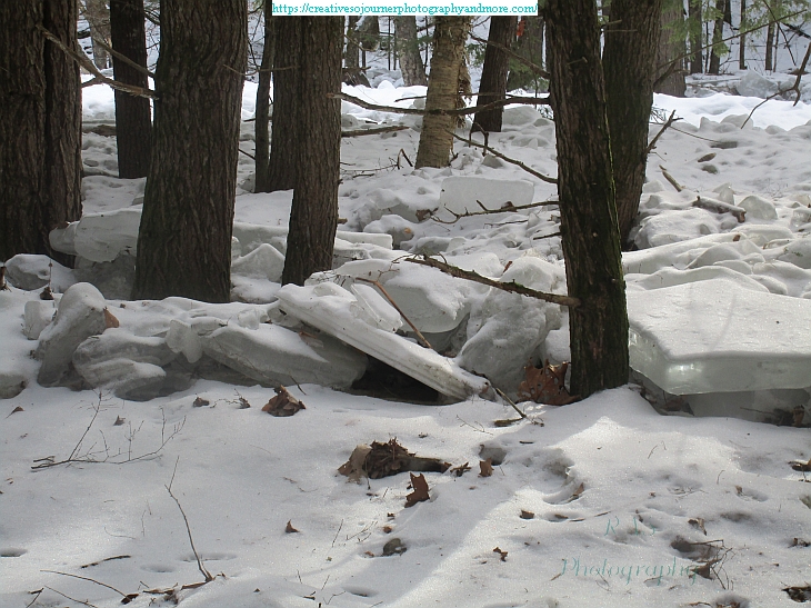 On a recent walk through the woods, my mom and I saw lots of stacks of ice piled up near the brook, probably caused by ice jams making the water come into the woods: