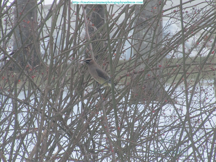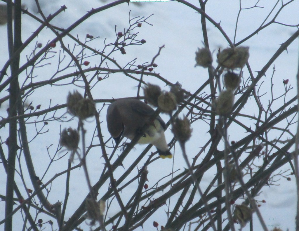 I’ve been seeing a flock of Cedar Waxwings visit our wild rose bush recently: