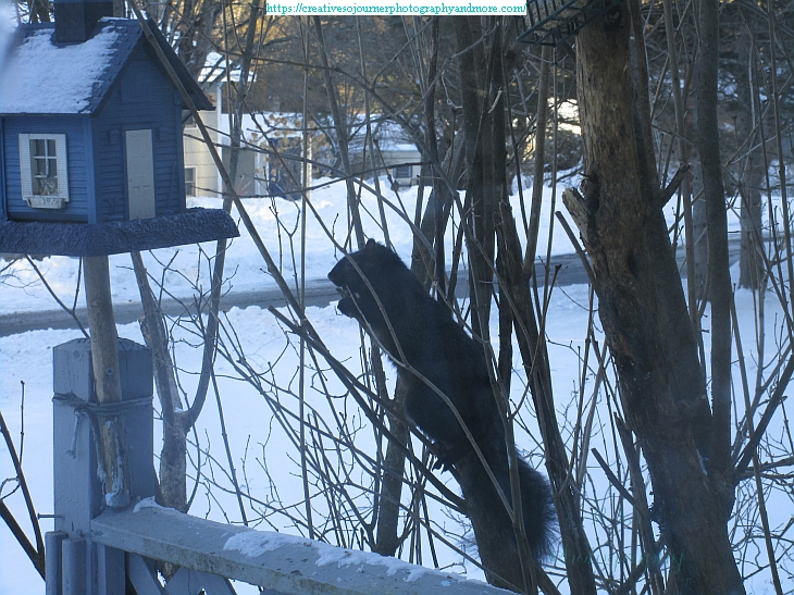One of the animals besides birds that we see at our feeders is this black squirrel. It has to do some acrobatics in order to get the sunflower seeds: