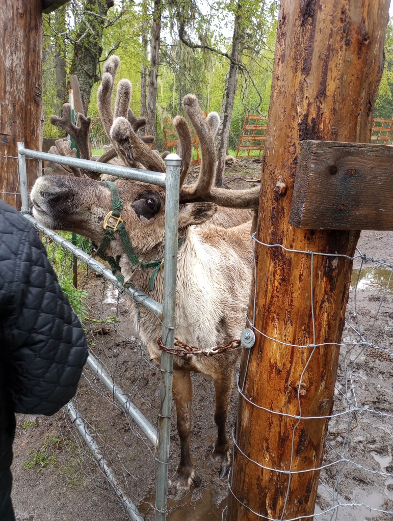 I got to see a couple of reindeer the other day on an excursion. I even got to feed them a graham cracker with my teeth! Only in Alaska…Reindeer are domesticated caribou…