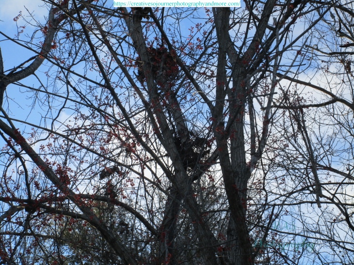 While on a recent walk through town, I happened to look up at this tree and noticed it was covered with bittersweet, and it has some kind of nest…perhaps a squirrel’s?