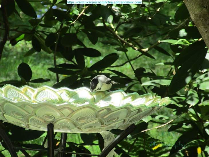 Chickadees are one of several kinds of birds who enjoy getting a drink and bathing at our bird bath: