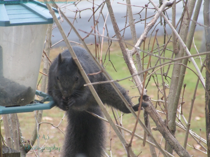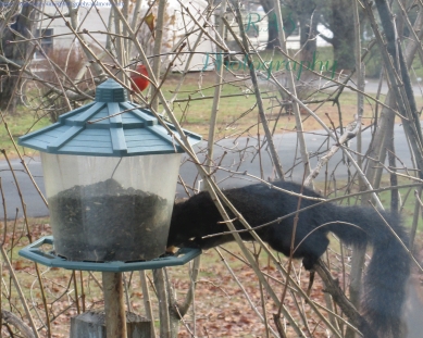 Bird feeders are not just for the birds! Squirrels also love to come get some food…like this black squirrel, doing fancy acrobatics in order to reach the sunflower seeds!